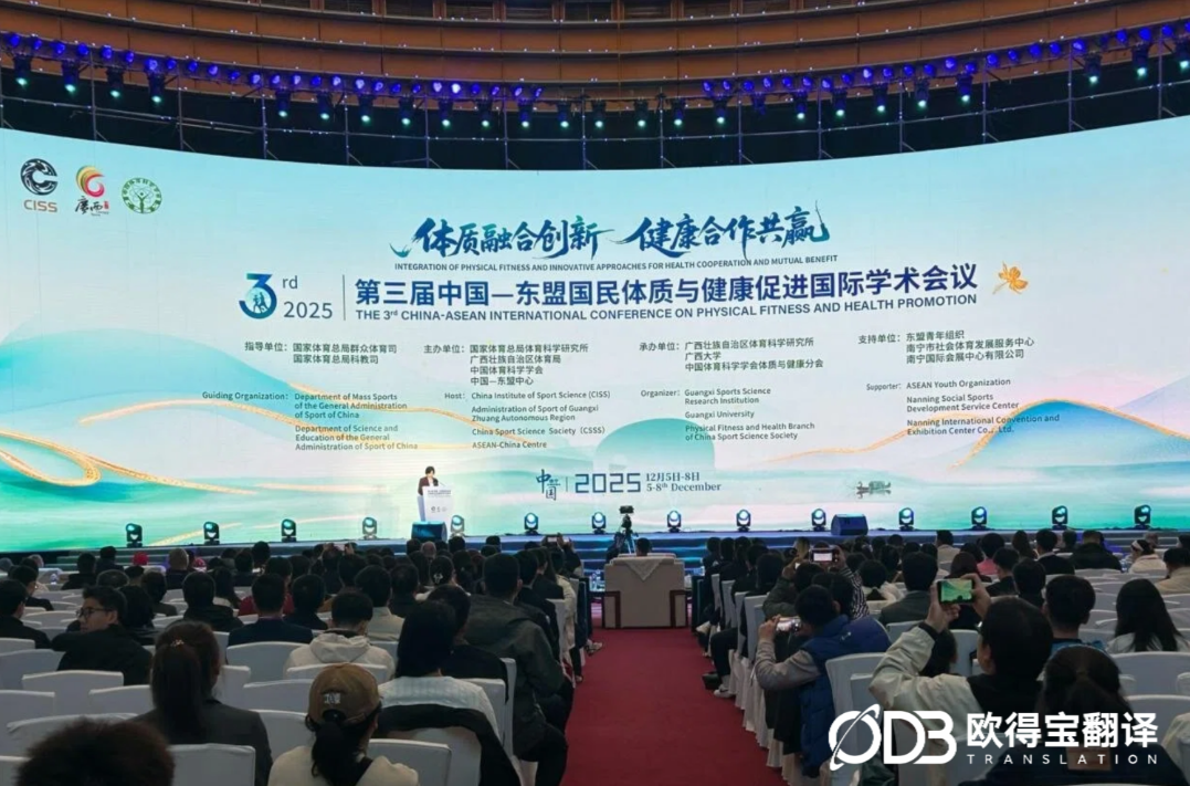 12月6日,第三届中国—东盟国民体质与健康促进国际学术会议在南宁隆重开幕,这是中国—东盟人文交流年的重要活动。欧得宝翻译凭借深厚的行业经验与专业的技术能力,为大会提供了全程中英双语同声传译与实时字幕服务,保障了这场高端国际对话的顺畅与精准。